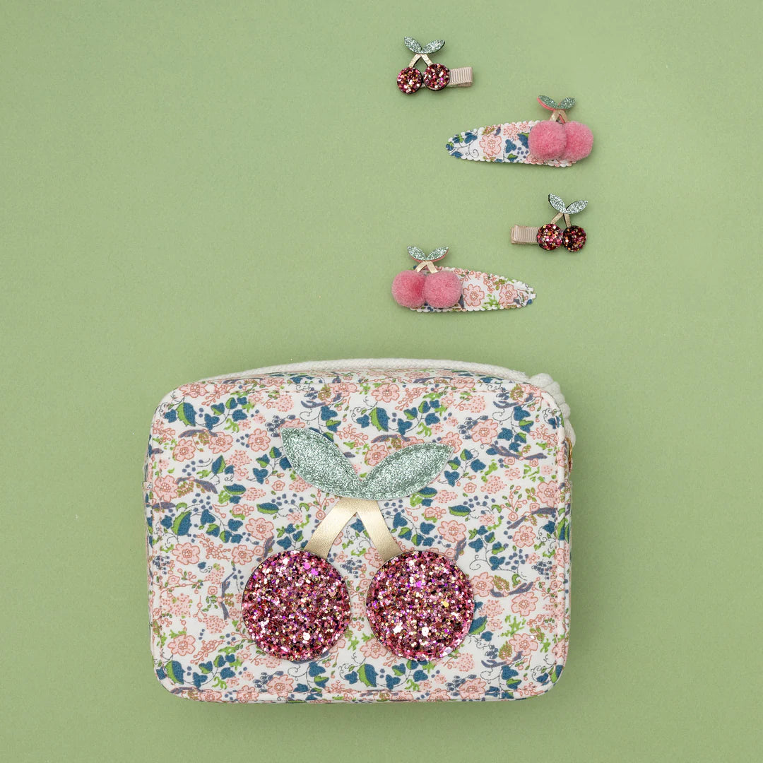 Crafted from a ditsy print floral fabric with glitter cherries and zip top closure