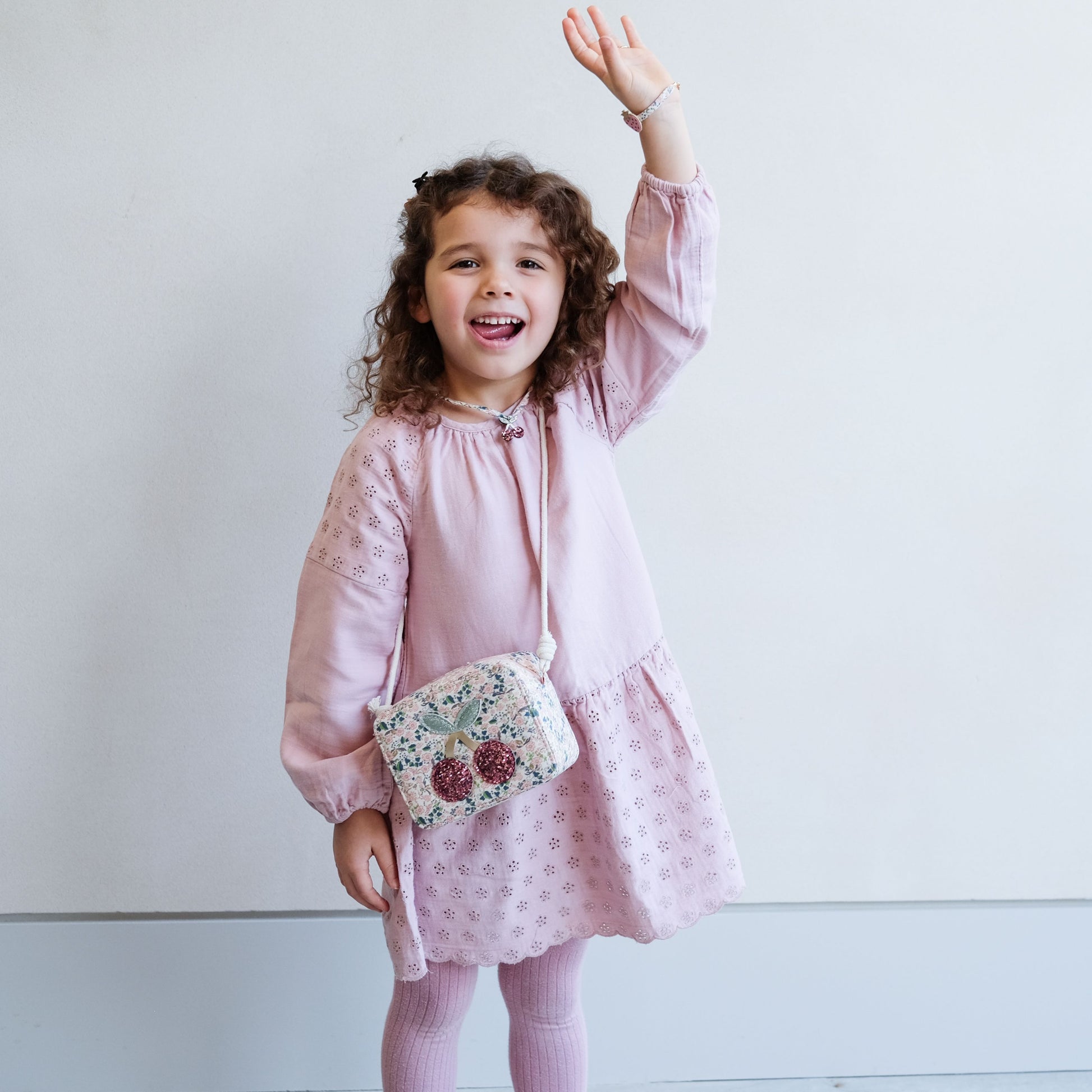Our bestselling cherries bag is back... now in the prettiest floral print fabric! They'll love that this beautiful bag is big enough to carry around all their important bits and bobs!