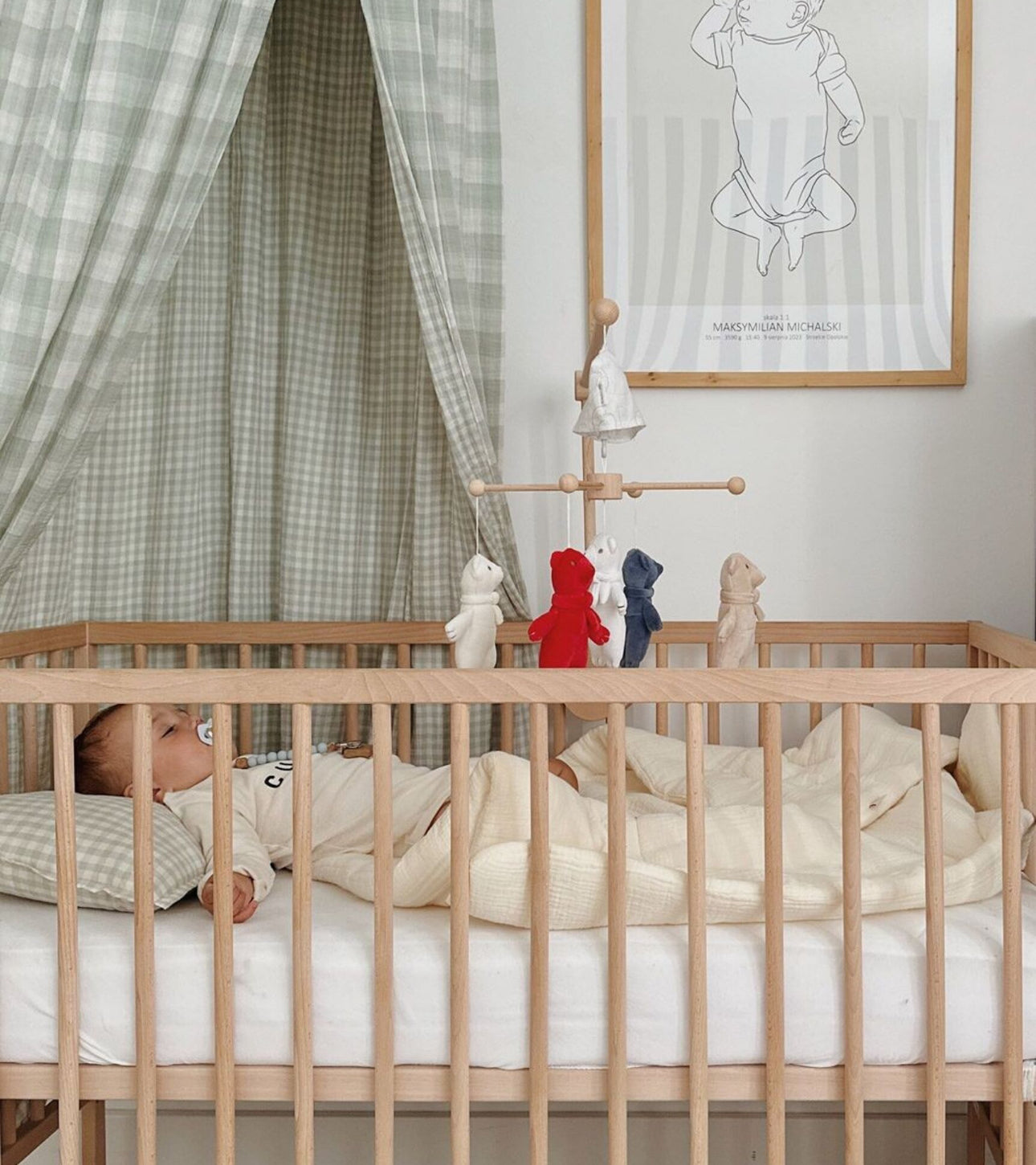A wooden musical mobile carousel with a rotating music box hidden under a "cap". After winding, the soft toys gently rotate whilst a melody plays to create a calm