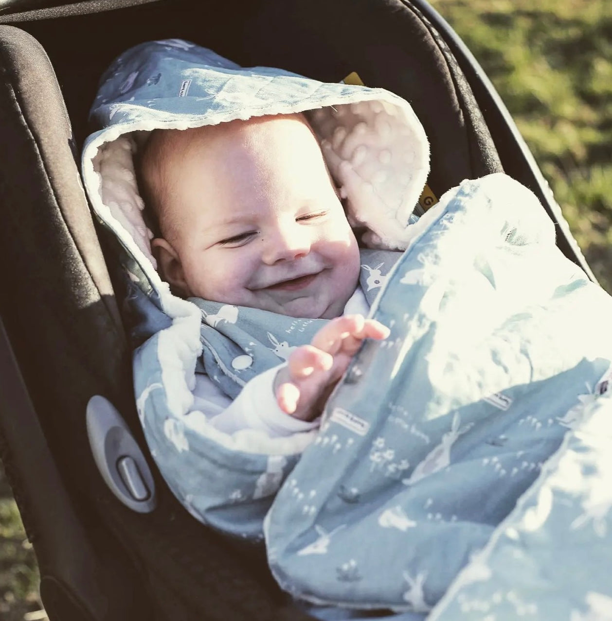 A 5 point harness car seat blanket 85cm x 85cm with two velcro strips these blankets will fit into any car seat. Suitable for babies in their first stage car seat. This blanket will also conveniently fit onto a buggy.