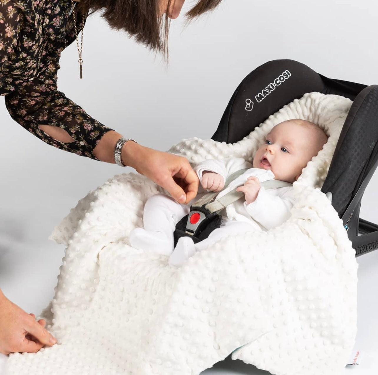 A 5 point harness car seat blanket 85cm x 85cm with two velcro strips these blankets will fit into any car seat. Suitable for babies in their first stage car seat. This blanket will also conveniently fit onto a buggy.