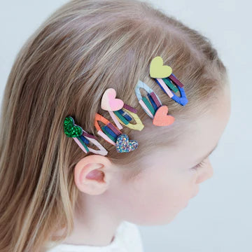 - 4cm grosgrain ribbon wrapped mini clips with contrasting leatherette hearts in a mix of finishes sat atop multicoloured grosgrain ribbon trails