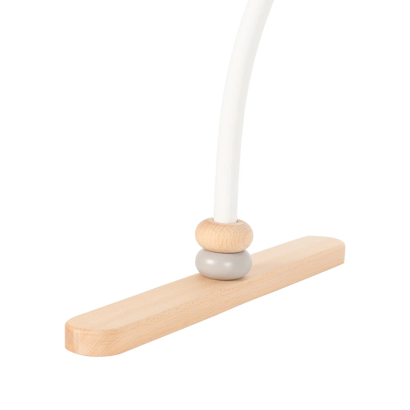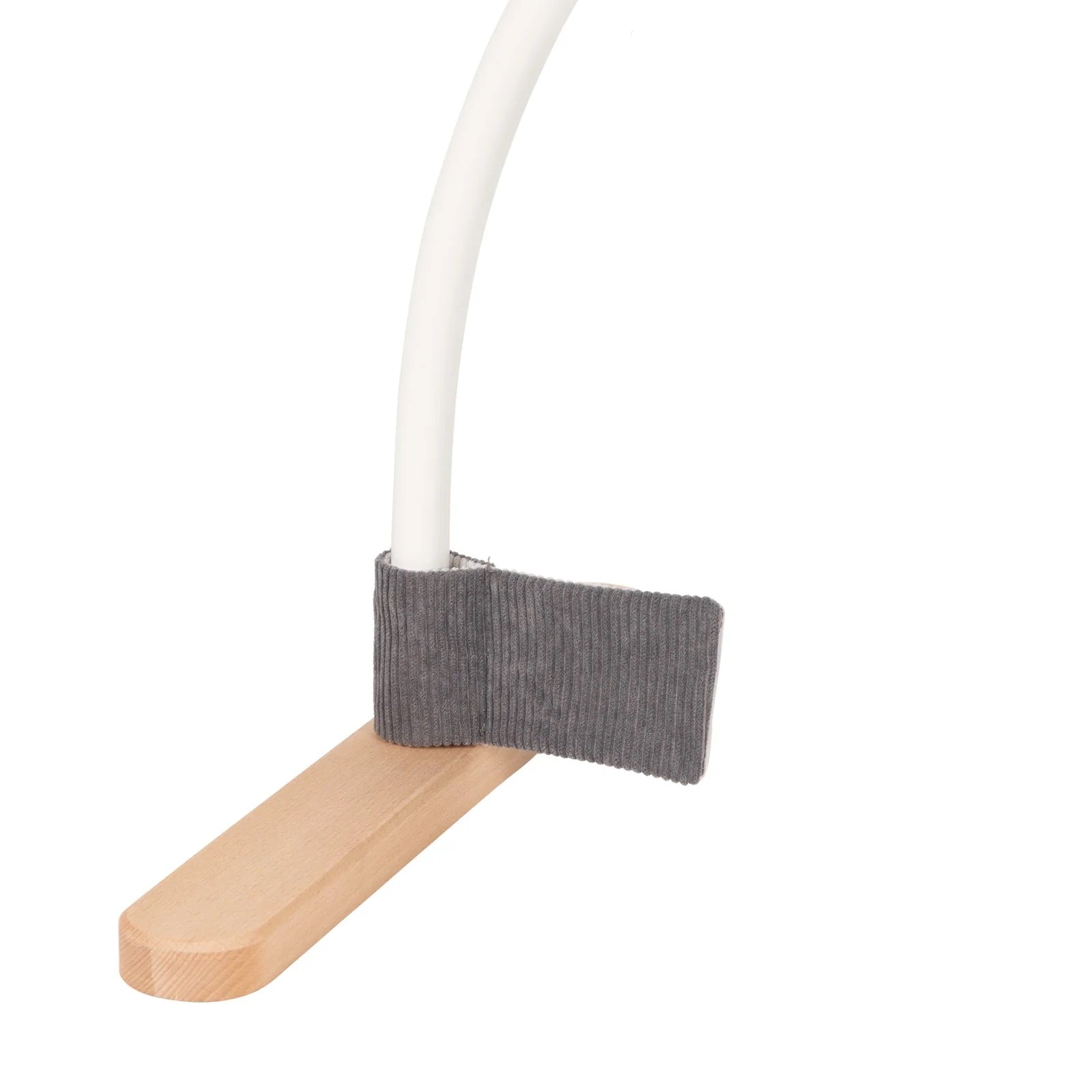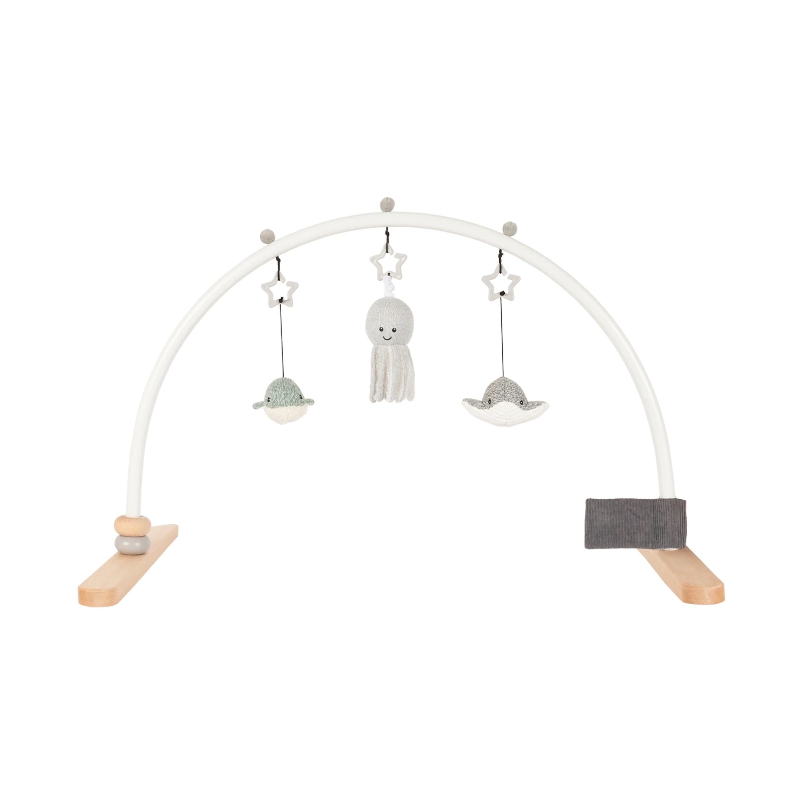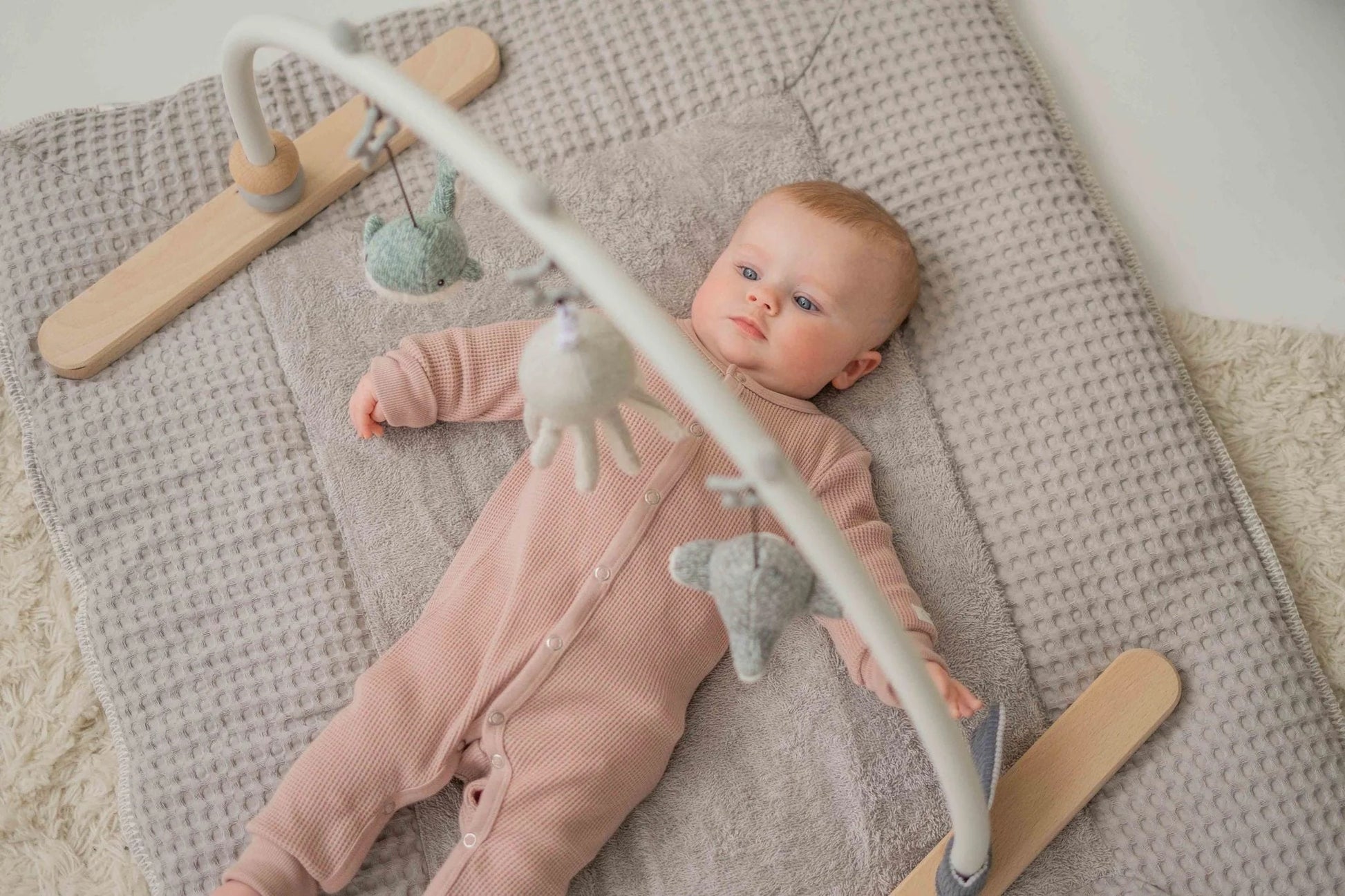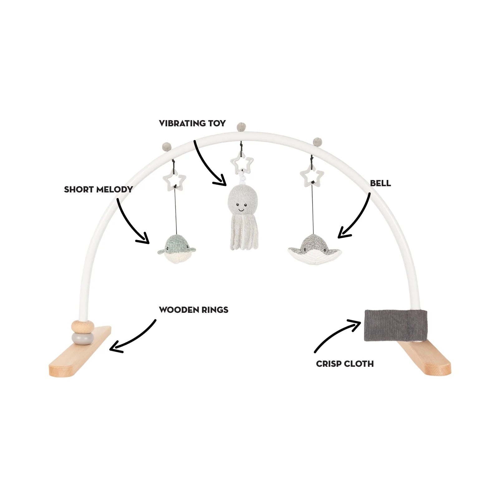 Our Baby Gym Ocean will make sure your little one can entertain themself for hours. There is enough to explore by watching, feeling and hearing. This supports your baby when they are developing all their senses. On top of that, your baby will get more and more control of their grip and they learn that toys move when you touch or grab them. Baby Gym Ocean has 3 fun toys: A ray with bell, an octopus with a vibrate function and a whale with a happy melody. On the sides of the Baby Gym there is a crisp cloth and two wooden rings. You can easily attach and detach the toys so you can use them as a separate toy.