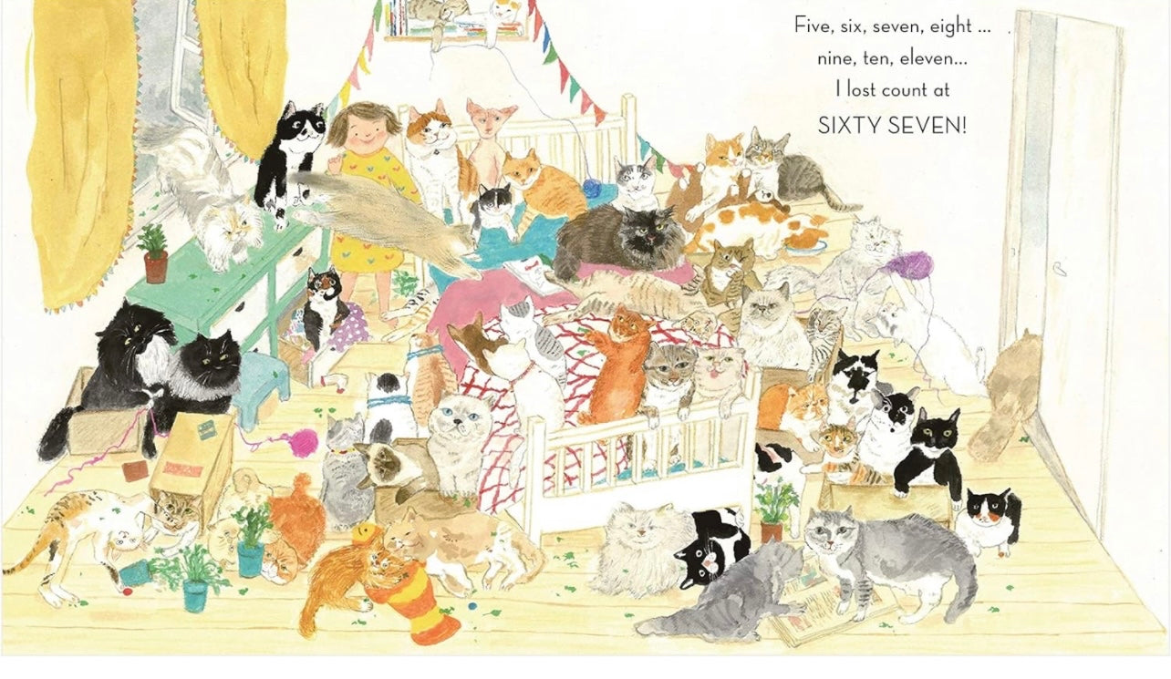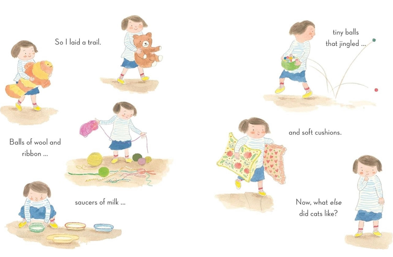 The leading lady of this tale longs for a pet cat to cuddle and call her own – a furry fluffball, just like the one in her book. So, after studying her grandma’s cat, Hector, she lays a trail with all the things that she knows cats love – balls of wool, saucers of milk, cardboard boxes and catnip aplenty. And then she waits for a cat to come…